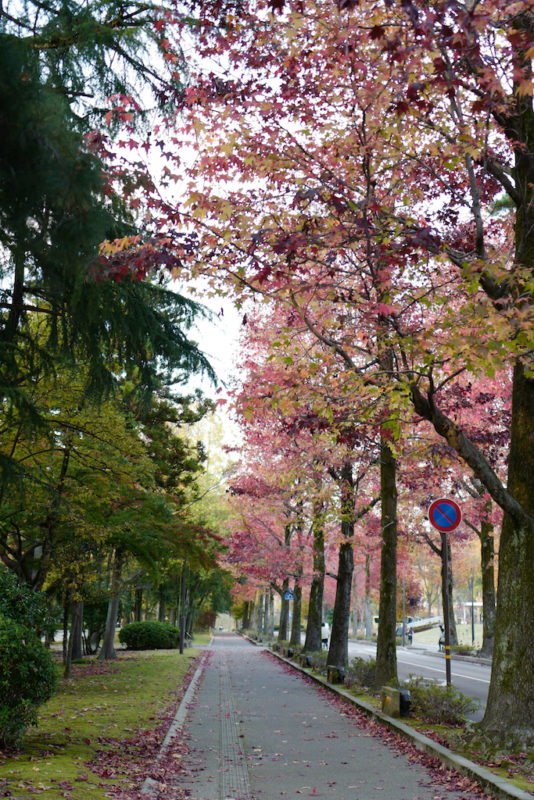 振り返ると紅葉がまだ残っていて、広場には、去り行く秋の赤色がちらほら。