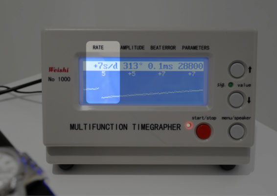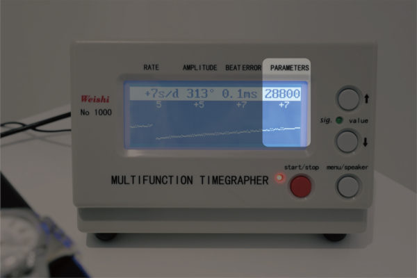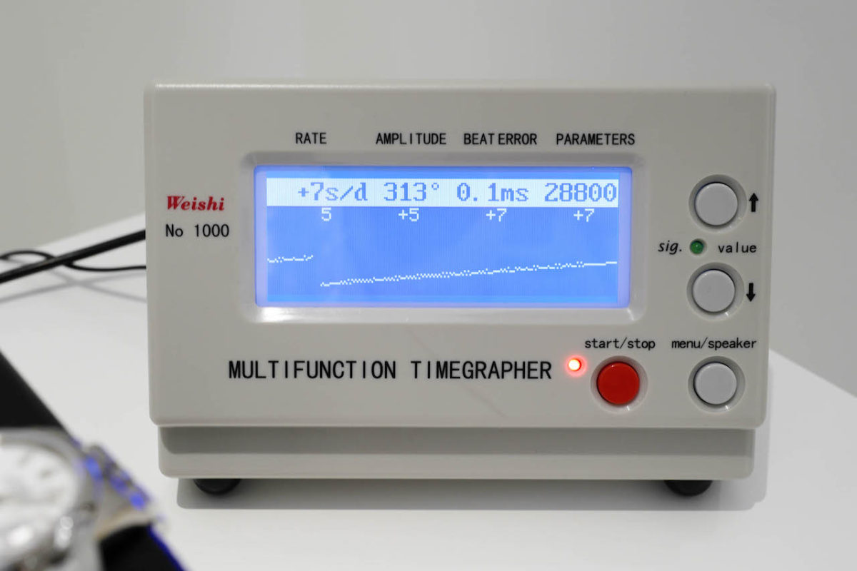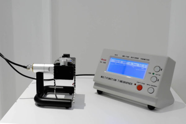 このような機械で行います。なんだか昔のスパイ映画に出てきそうなマシン。こちらに時計をセットしまして、心電図を測るように、時計の鼓動とでも言いますか、「機械の振動数」「振りの強さ」「バランス」「進みや遅れ」を計測していきます。