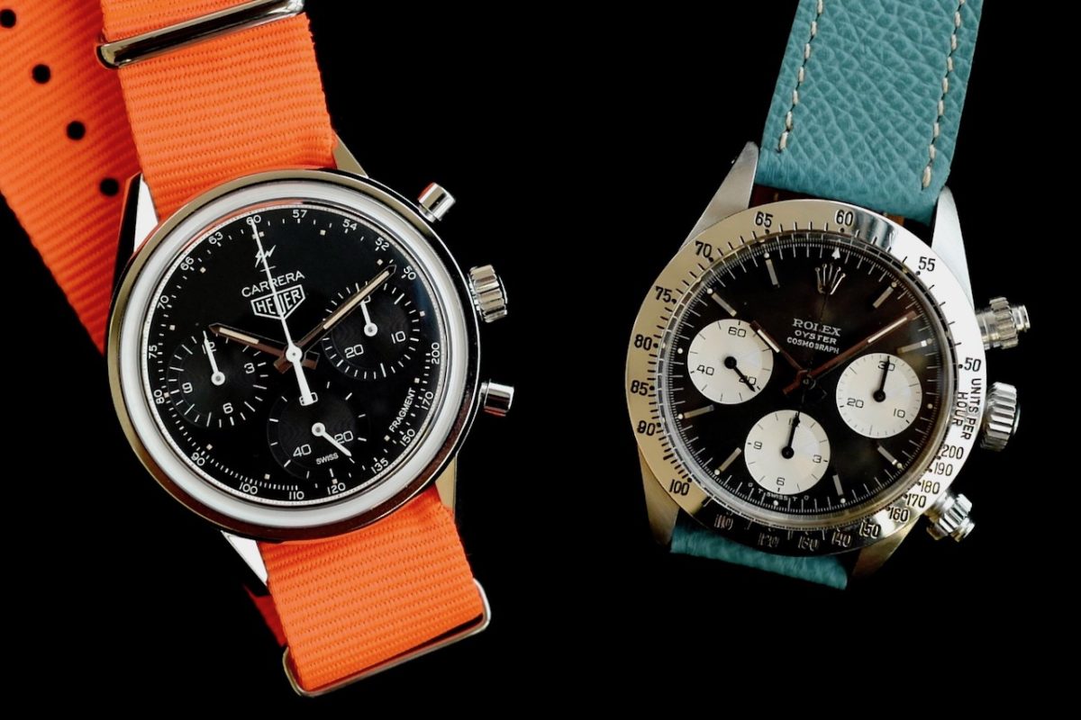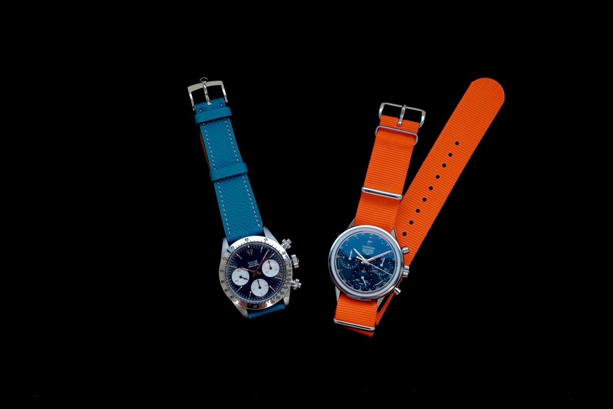 Leatherのブルー・ストラップ(左)と今回発売の”NEON HERMES ORANGE NATO” 20mm仕様ですが、±1mm位でしたら対応可能です