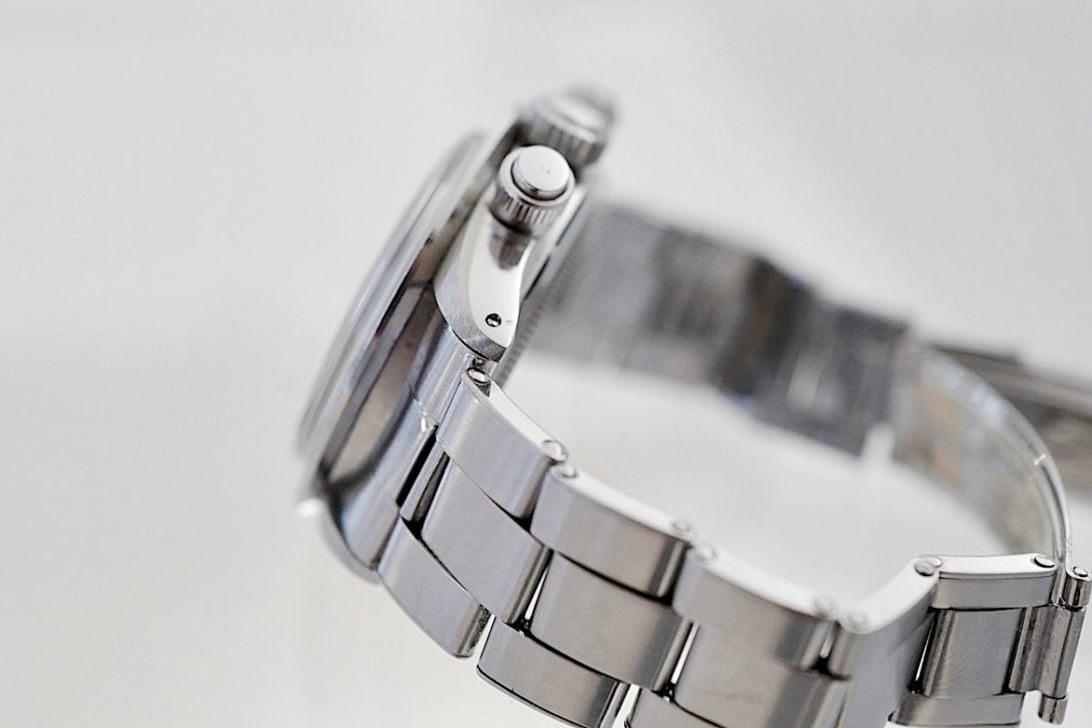 ケースはノンオイスター同様の小ぶりなコロッとした感じで、試作?で作られたプッシャーは真鍮製。そこにメッキを施してある為、多くは擦れて下地の真鍮が見えています。プッシャーのネジ山はフラットで浅く試行錯誤の跡が伺えます。
