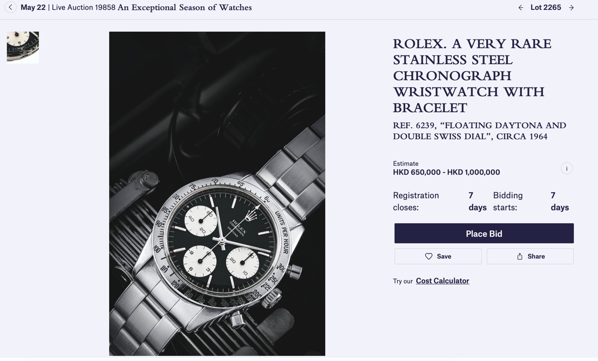 このデイトナ、フローティングデイトナ(ロゴ)とも呼ばれます。5月22日香港のクリスティーズに同じ個体が出ます。