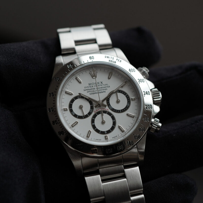 白のシミひとつ無いダイヤルにポーセリンダイヤルのようなこんもりと盛り上がったフォント。そしてホワイトゴールド製のインデックス等、シンプルなのにキラキラしてます。見た目は決して派手ではないですが、ふとした瞬間にキラッと光るところがロレックスのフラッグシップなんですね、、、。この僅かな素材の選び方や形状、そしてデザインディテールの違いが他の時計と大きく違う差になってくるんでしょうね、もちろん価格もですが。
