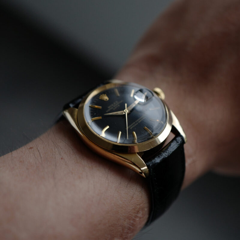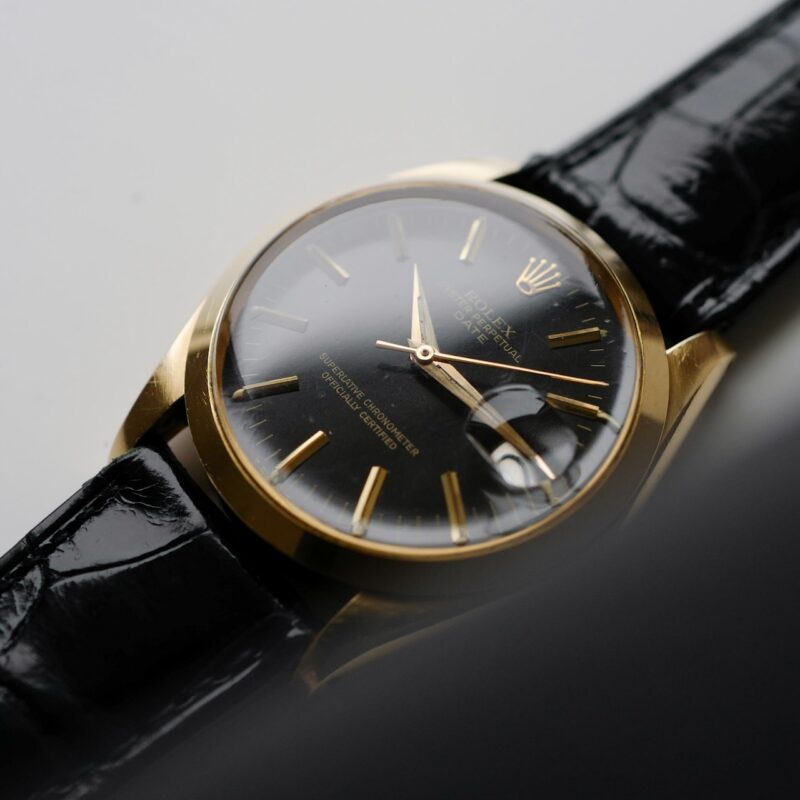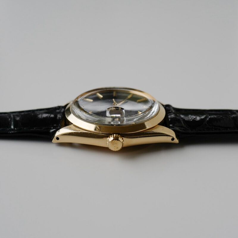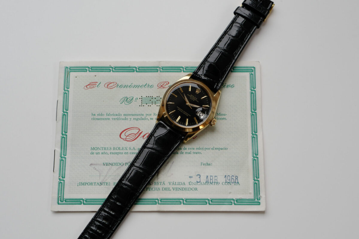 比較的、金無垢が少ないオイスターパーペチュアルデイト。そうなんです、デイトジャストではありません。デイトジャストですとかなり素材・文字盤のバリエーションが豊富になりますが、こちらはパーペチュアルデイト。シリアルから1966年製のブラックミラーダイヤルに金無垢ケースの組み合わせ。