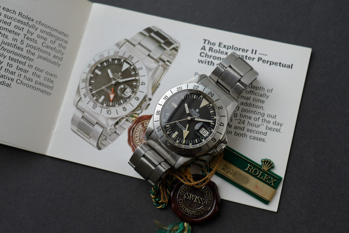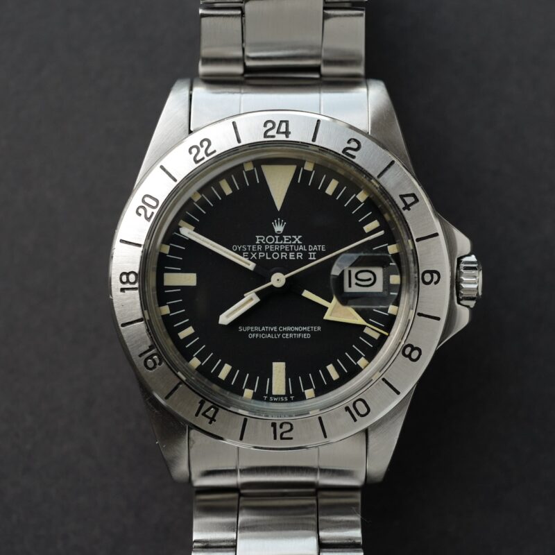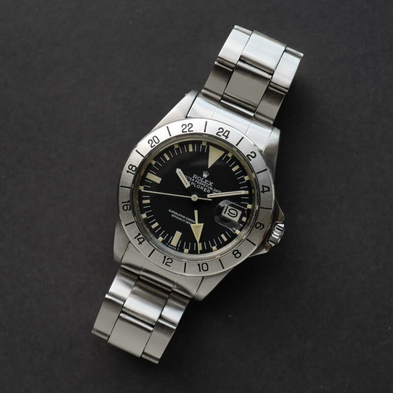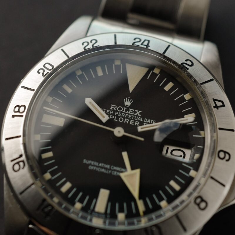 文字盤・夜光の状態も非常に良く、レモンイエローにエイジングした24時間針が自然に収まり、エクスプローラー2特有の派手さはない感じです。