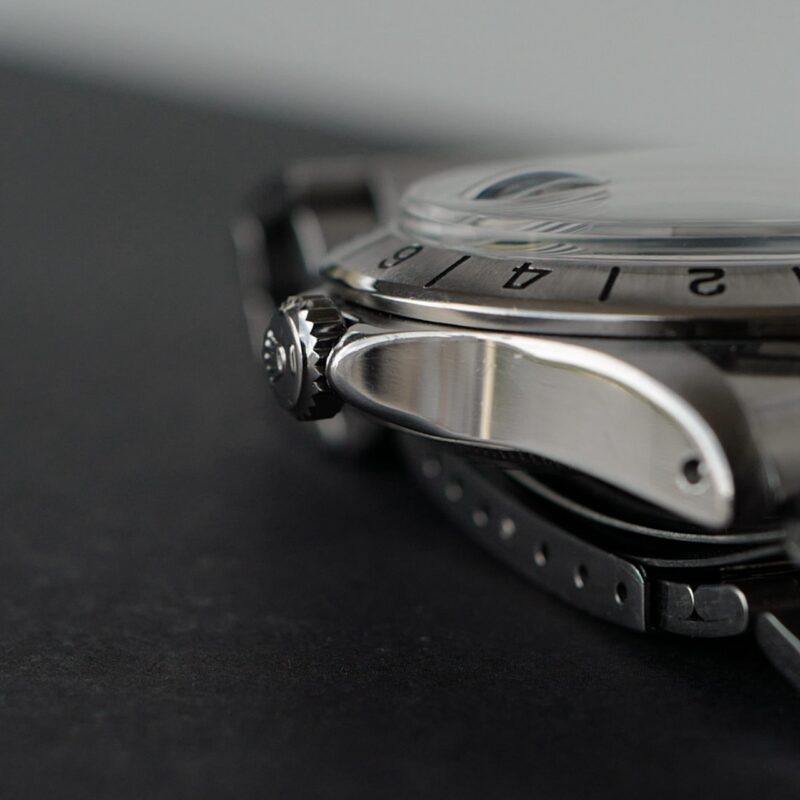 上の画像でお分かりかと思いますが、初期のケースなので、リューズガードが小さく丸いです。71年と72年モデルの特徴です。