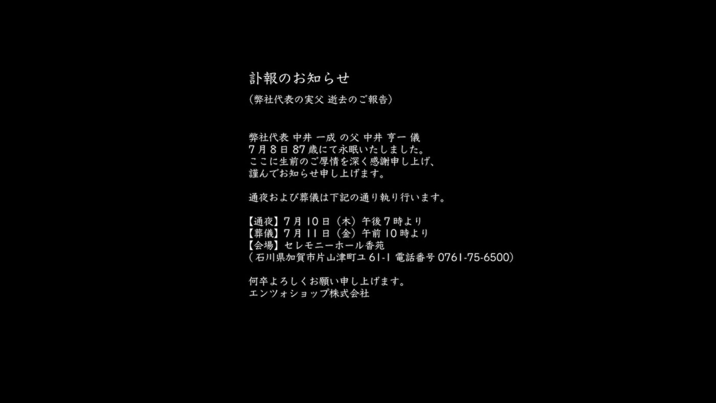 7月8日 87歳にて永眠いたしました。ここに生前のご厚情を深く感謝申し上げ、謹んでお知らせ申し上げます。