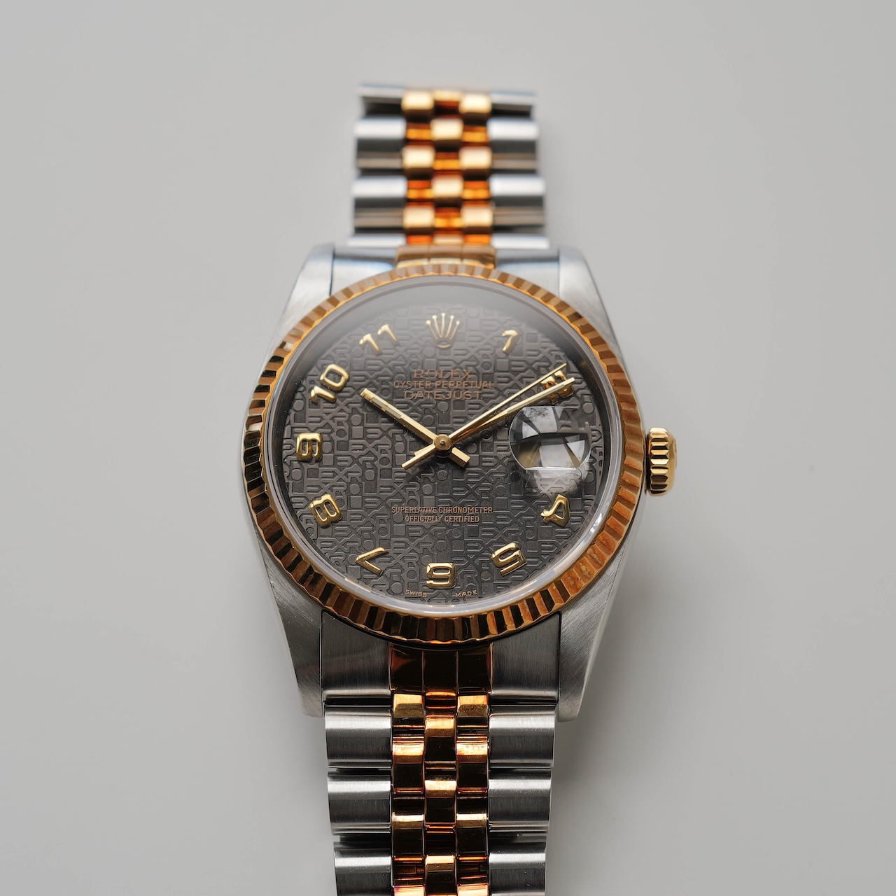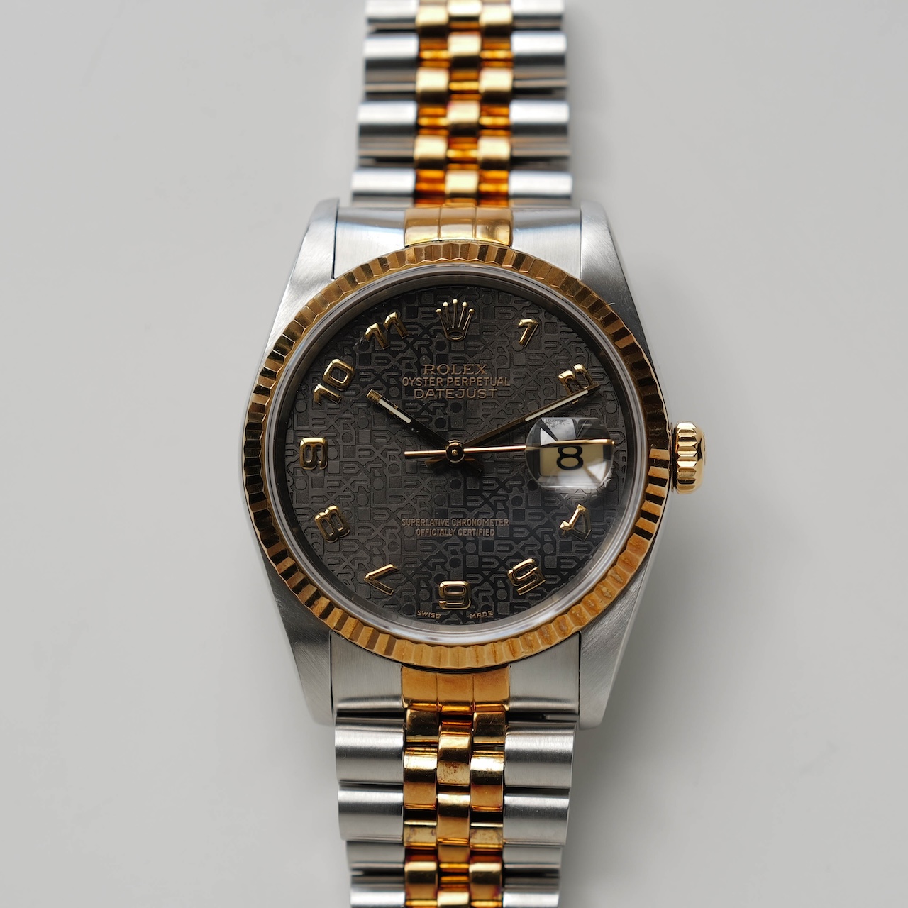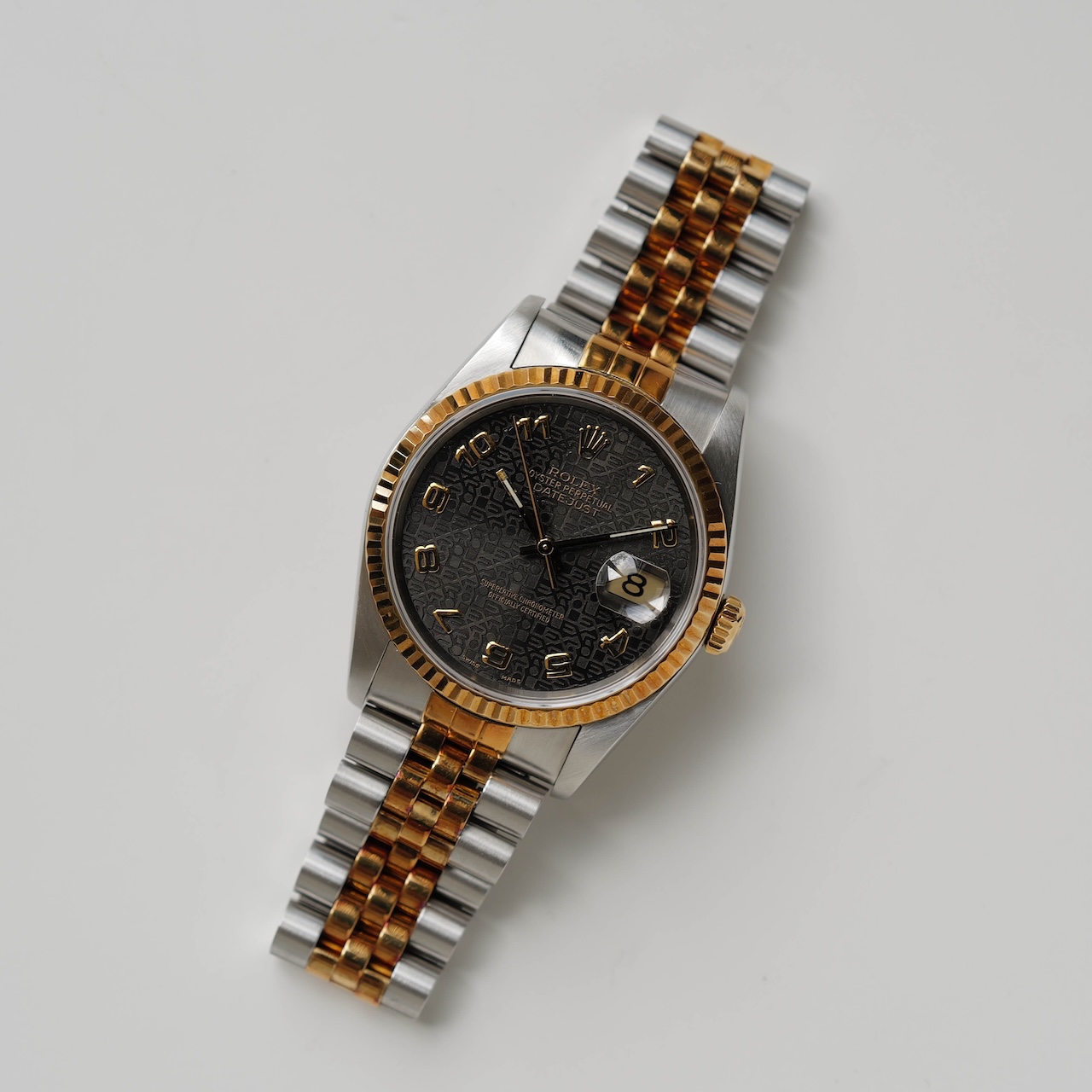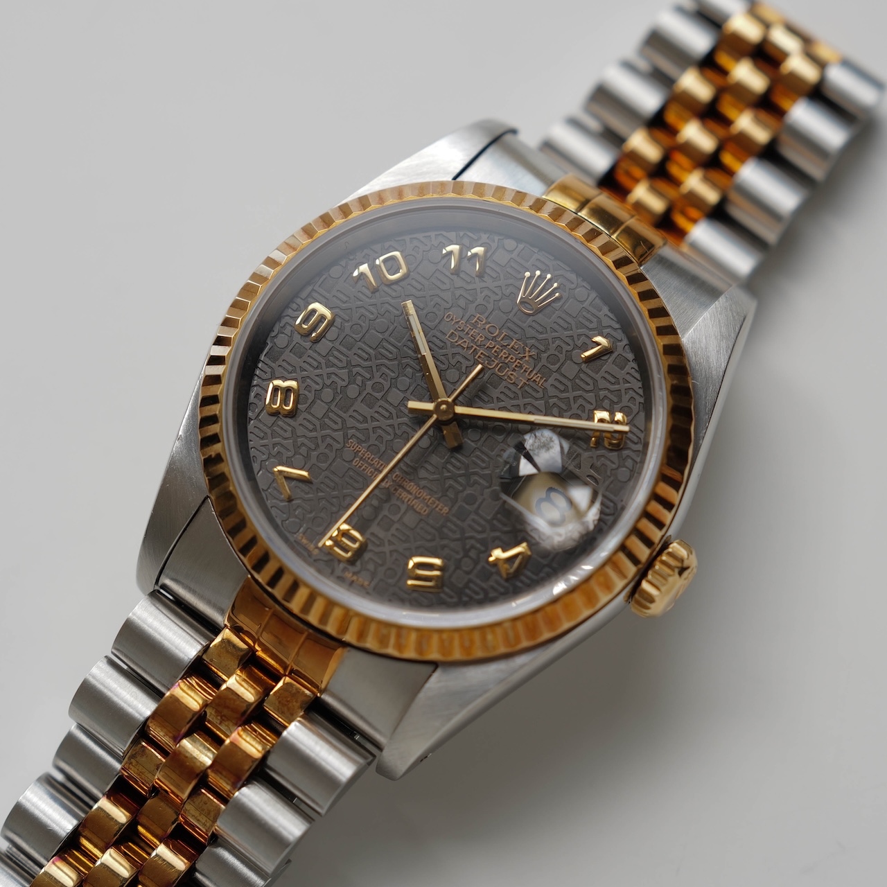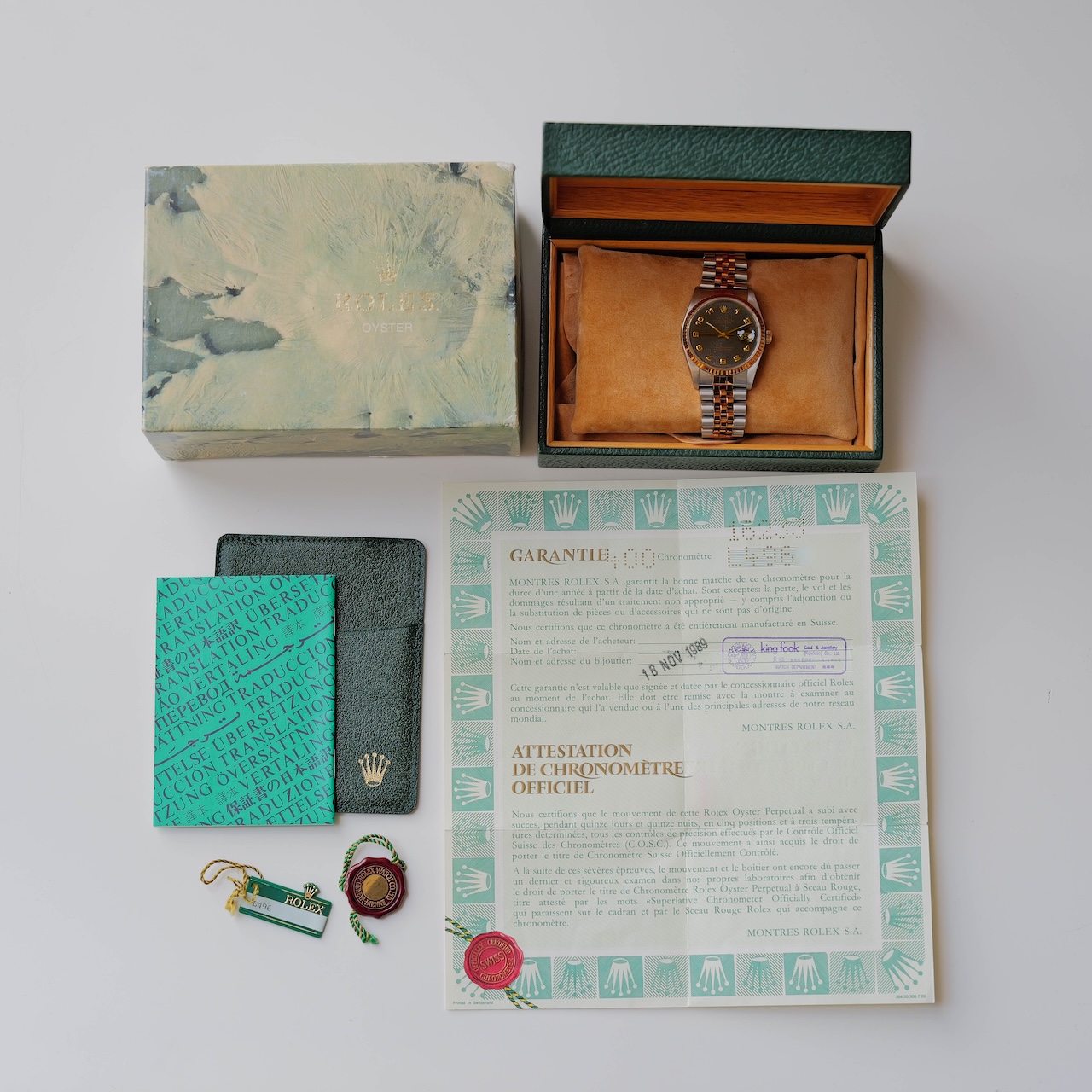 ロレックス/デイトジャスト16233/L番/グラファイトグレーコンピューターダイヤル/アラビアインデックス/18KYG/箱保証書つき/ROLEX DATE-JUST REF.16233 18KYG “GREY COMPUTER” with Paper and Box 1989y