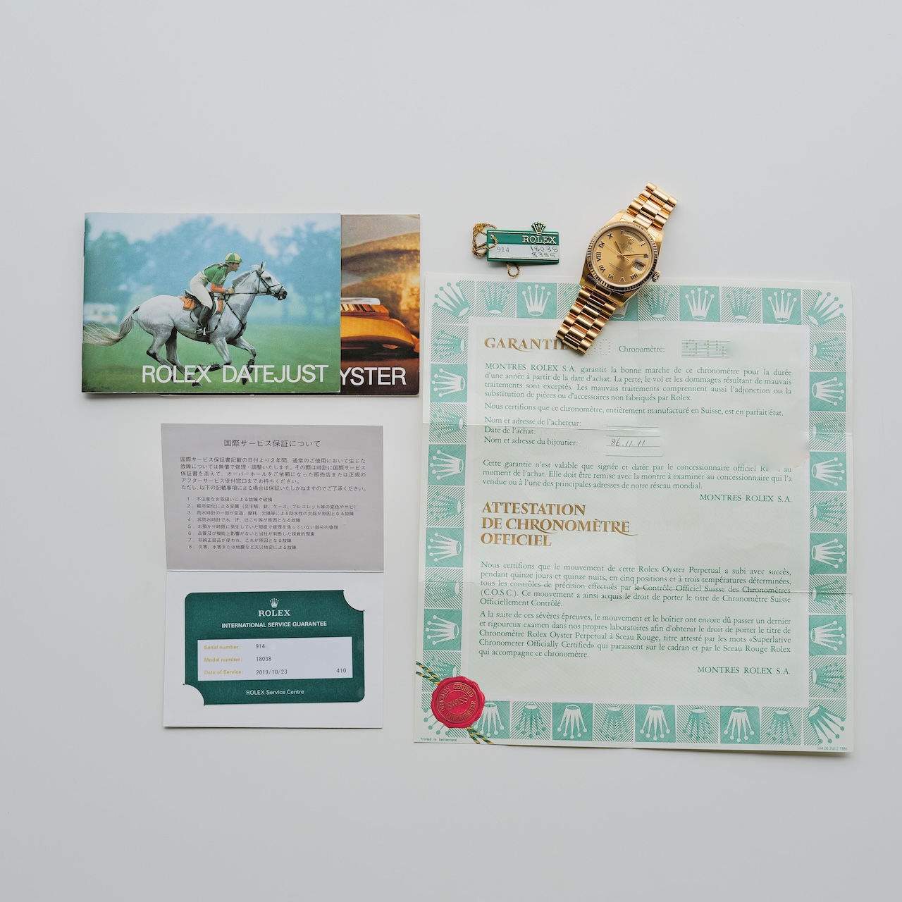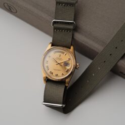 A thick case 18038 Roman index with warranty. The Roman index has black paint in it, making it look like a blackout, and the hands also have a thin black paint in the center, which is a rare specification. Since it does not use any luminous material, it is safe in many ways in the future, and after all, luminous material is not necessary for a high-end dress watch. When I tried matching this high-end DayDate with a double RL olive NATO, it had an indescribable atmosphere of looseness. I thought that wearing it like this would be extremely good to give off an adult sense of ease.