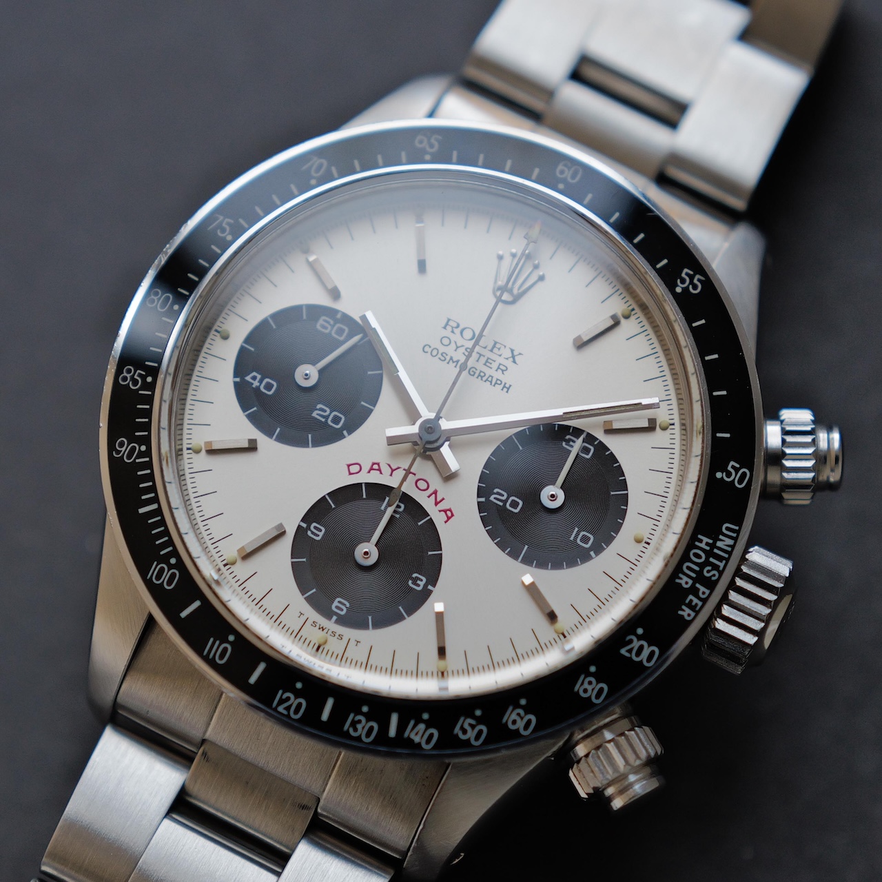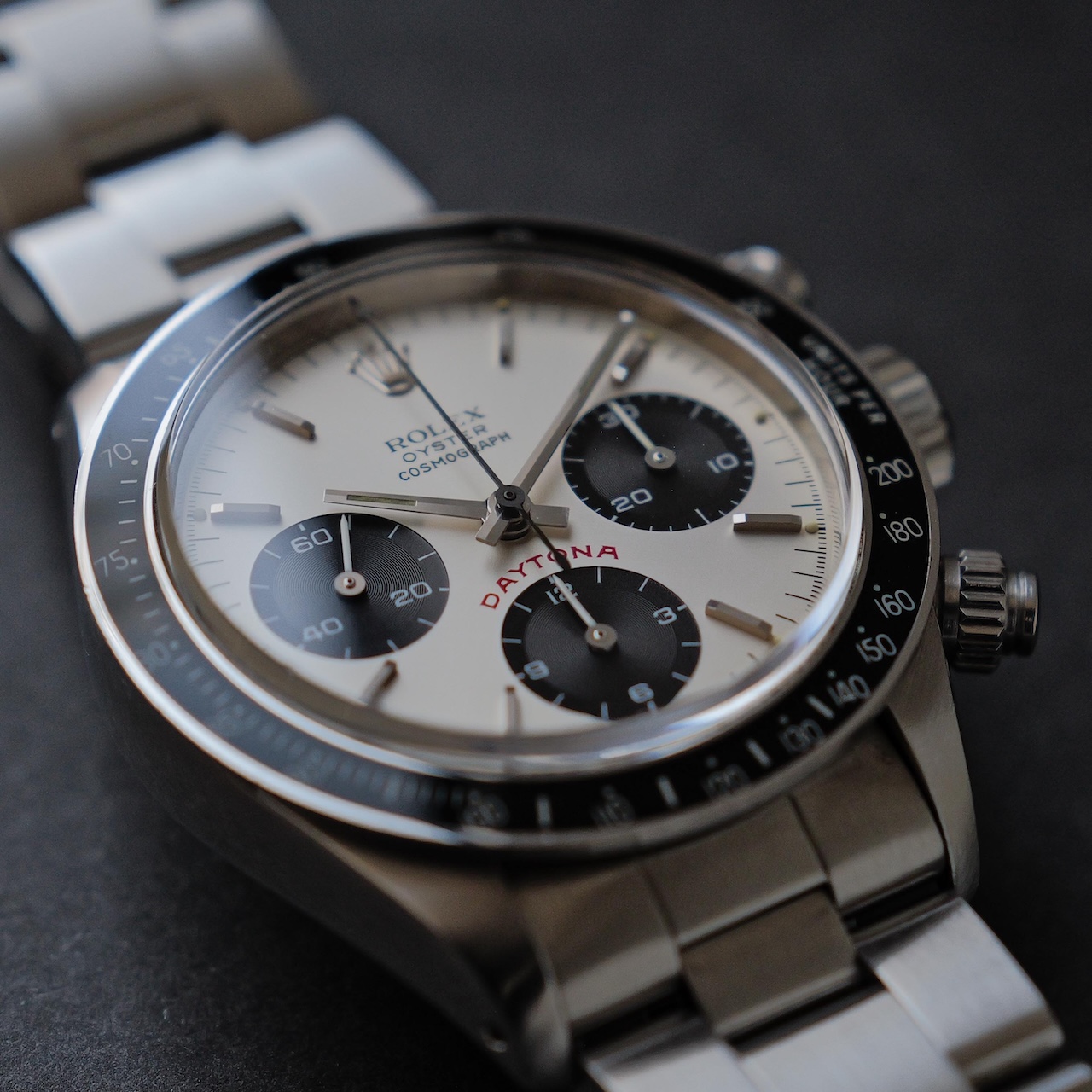 DAYTONA6293Big red Floating daytona. 1982-83y Floating Daytona with official domestic warranty has arrived. It comes with a 1982 printed instruction manual, and when I lined it up with the image on the first page of the spread, the dial is of course big and floating, and the case shape is exactly the same as in the pamphlet, so you can see that it is in good condition. The dial is beautiful with no stains or corrosion, and no luminous loss. The hands are also original. The bezel and pushers were replaced at the last overhaul by Rolex Japan in 2004, but this may be a good thing for you to keep it for a long time. Personally, I like this watch very much.