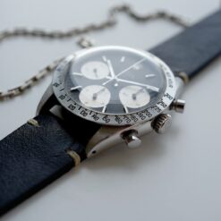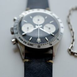 極めて珍しいデイトナが入荷。”デイトナ”と名前が付いたのは、リファレンス6238から6239に移行してからで、タキメーターベゼルになったり文字盤が変わり、現在のデイトナに至ります。一番最初の6239デイトナには、正確にいうとDAYTONAの表記は無く、実質DAYTONA表記の文字盤はこちらが最初です。12時側に小さく間を空けて控えめにDAYTONAのシルバーで入ります。入ってないシルバーバーのモデルは通称ルマンと呼ばれ、こちらも希少です。