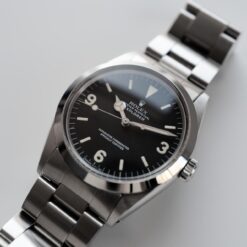 実質ワンオーナーのデッドストックに近いエクスプローラー1 ref.1016のR番。ファーストオーナーから僕が直接譲り受け、現在のオーナーの所に行き、今回めでたく戻って来ました。1016の実質最終モデルで少しだけ3/6/9がファットフォントの文字盤になります。画像でお分かりの通り全てにおいてパキッとしています。