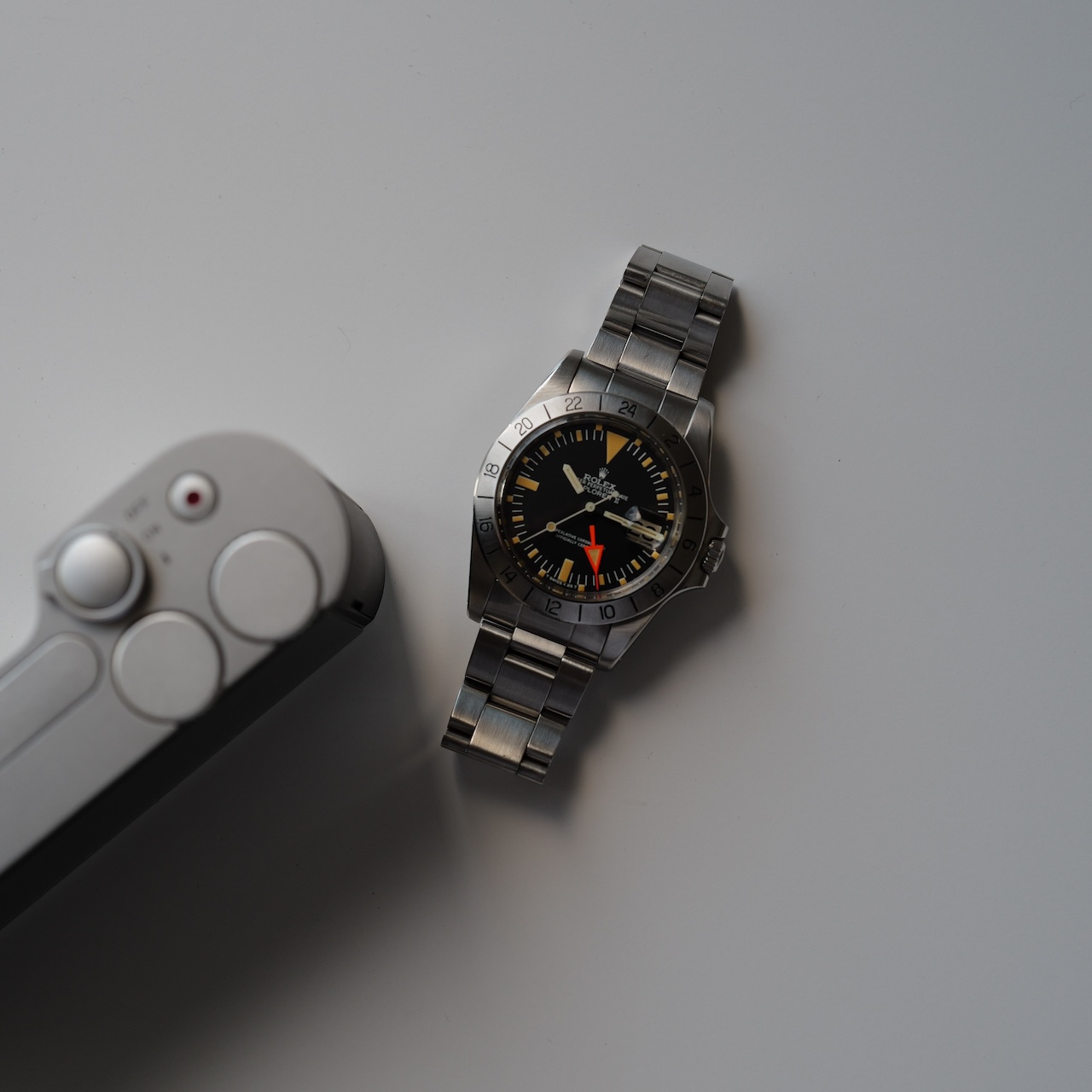 美しい4型のパティーナに濃いめオレンジの24時間針のエクスプローラー2の1980年製。コンディションが悪くてカボチャ色に変色した訳では無く、トリチウムの含有量によるエイジングでこのようになります。ベゼルやケースのコンディションも恐ろしく良くて、オリジナルのブレスのヨレも殆ど無いミントコンディション。