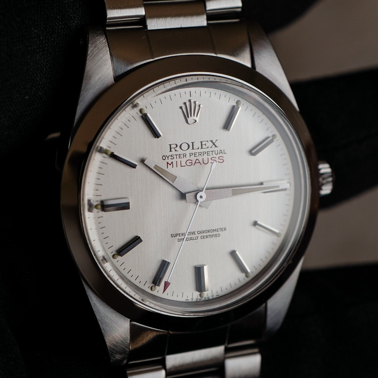 Silver dial of the later Milgauss model. Beautiful dial that could be called a vertical stripe version of the sunray finish. It is still in original condition with no luminous fallout or stains. This is one Milgauss watch that should be obtained before the current model is revived!