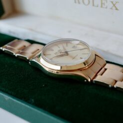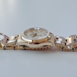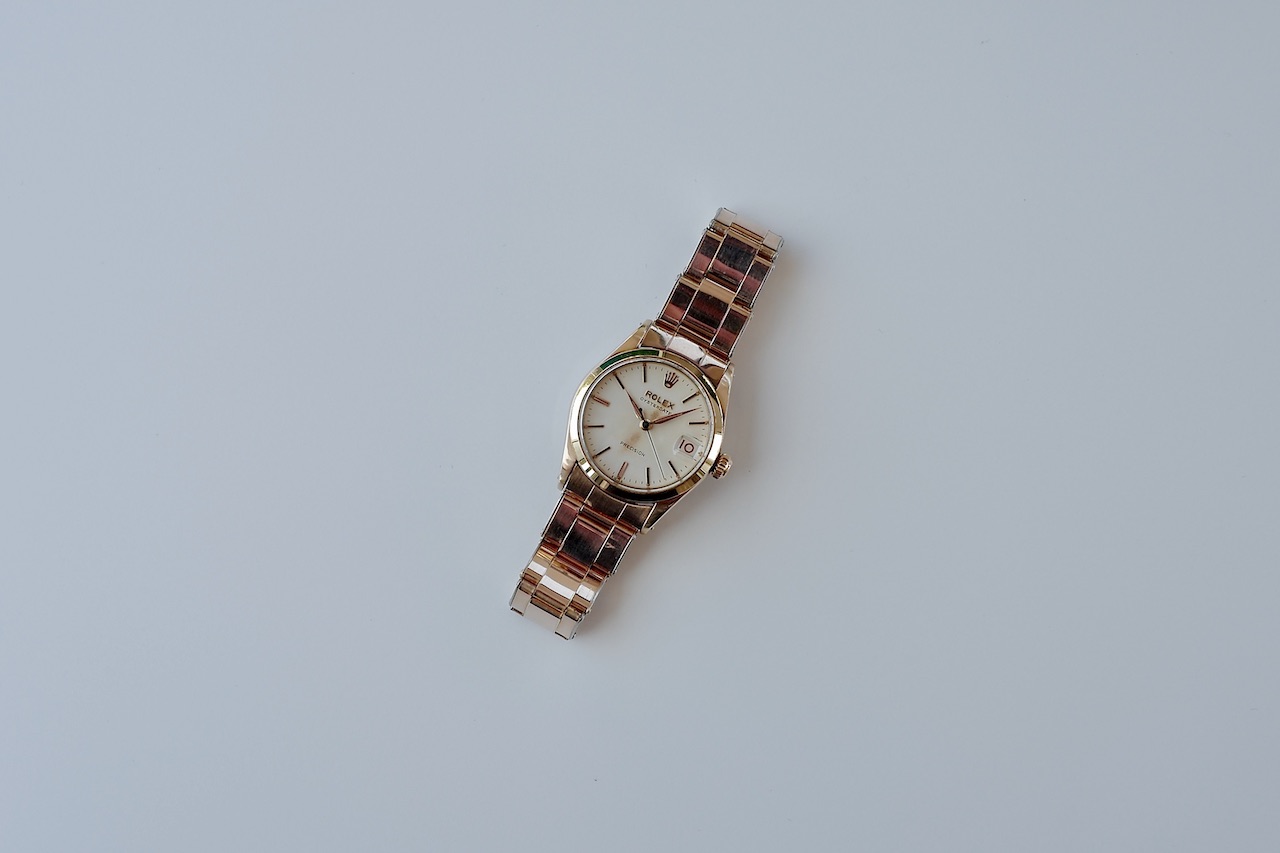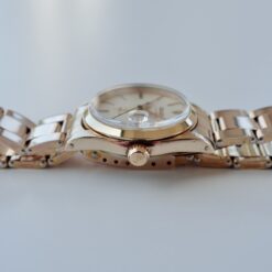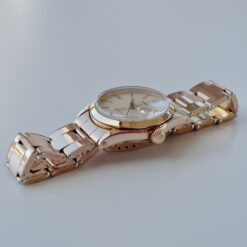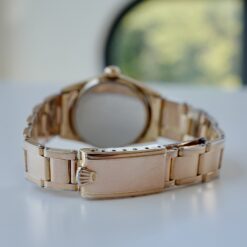 絶妙なサイズ感のオイスターデイト。美しく落ち着いたピンクゴールドがエレガントで上品です。金張り(ピンクゴールド)の珍しい仕様となってます。ブレスも当時のままで、クラスプ部分はビッグロゴです。購入時のレシート等も付属した男女兼用で嵌められる1本。