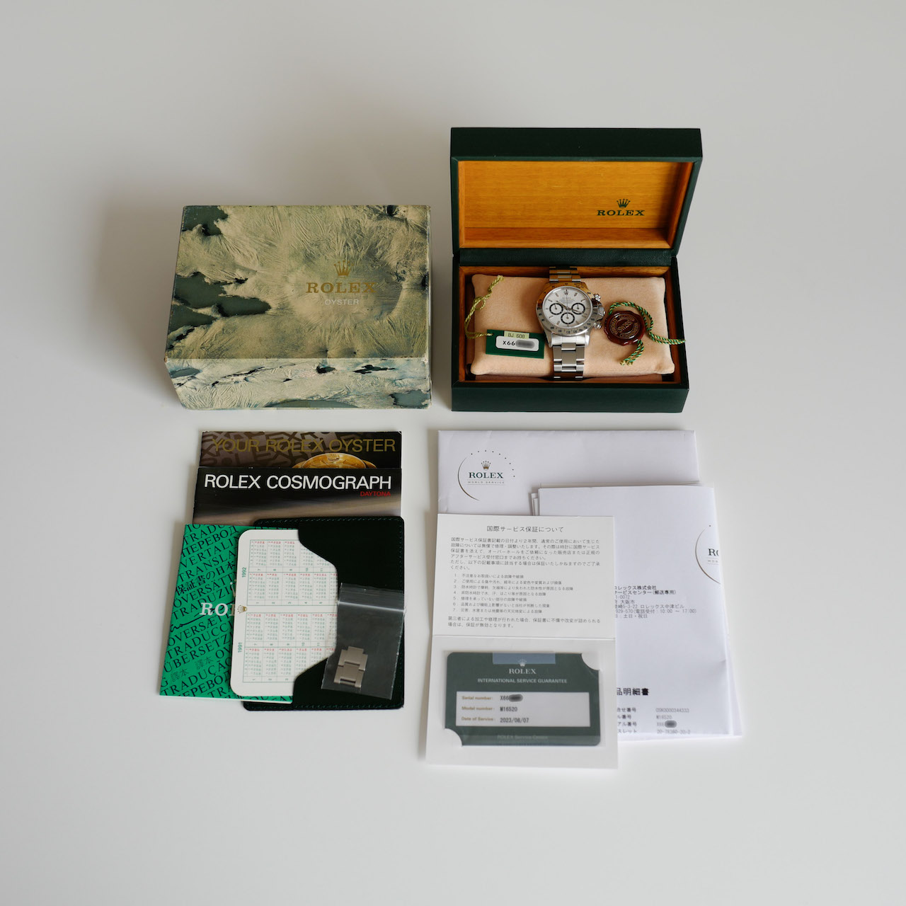 コンディションにつきましては、文字盤・針一式。ベゼル・ブレス等々オリジナルで、且つ今年の9月に日本ロレックスにてオーバーホールも済ませている優良個体です。針やベゼル等々含め、そのまま通過しています。今回のOH保証書が付属します。当時のプライスタグや取説、そして元箱も付いております。残縁ながらギャラのみありませんが、オリジナリティーとクオリティーは保証します。