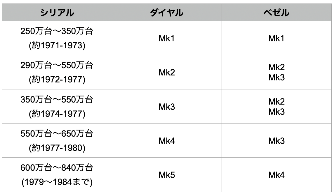 1974~1975年の個体には常にMk2ベゼルが装備されました。